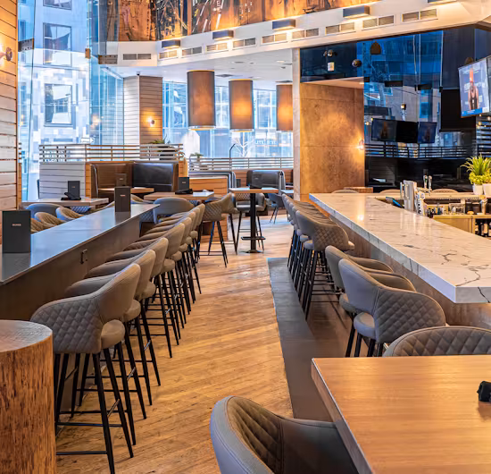 Moxies Toronto Downtown is one of the best premium casual restaurants in the Financial District, perfect for lunch, date nights or happy hour. Steps from Union Station, Scotiabank Arena and the Rogers Centre, Moxies is located at the corner of University Avenue and Wellington Street. Featuring two large bars and bright modern interior, Moxies is the perfect place to enjoy lunch with colleagues, dinner before a concert or to catch the game on one of our many flatscreen TVs, including all English Premier League matches. Enjoy our incredible outdoor patio and bar, with lush greenery and sleek decor.